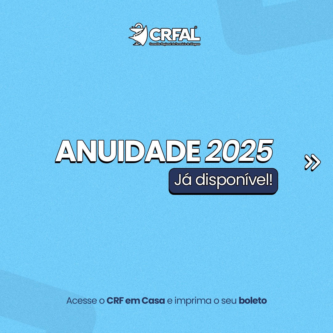 O Conselho Regional de Farmácia de Alagoas informa que os boletos de anuidade para pessoa física e jurídica já estão disponíveis para pagamento. Ele pode ser solicitado pelo proprietário ou pelo responsável técnico. Para imprimir, basta acessar o site www.crf-al.org.br e imprimir o boleto por meio do CRF em casa.
