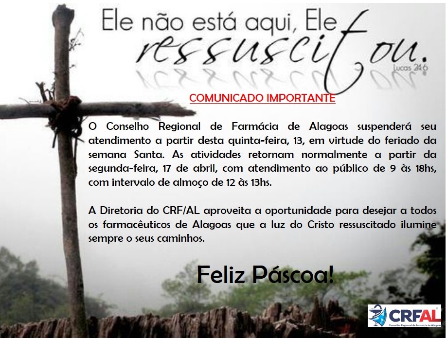 A Diretoria do CRF/AL aproveita a oportunidade para desejar a todos os farmacêuticos de Alagoas que a luz do Cristo ressuscitado ilumine sempre o seus caminhos.