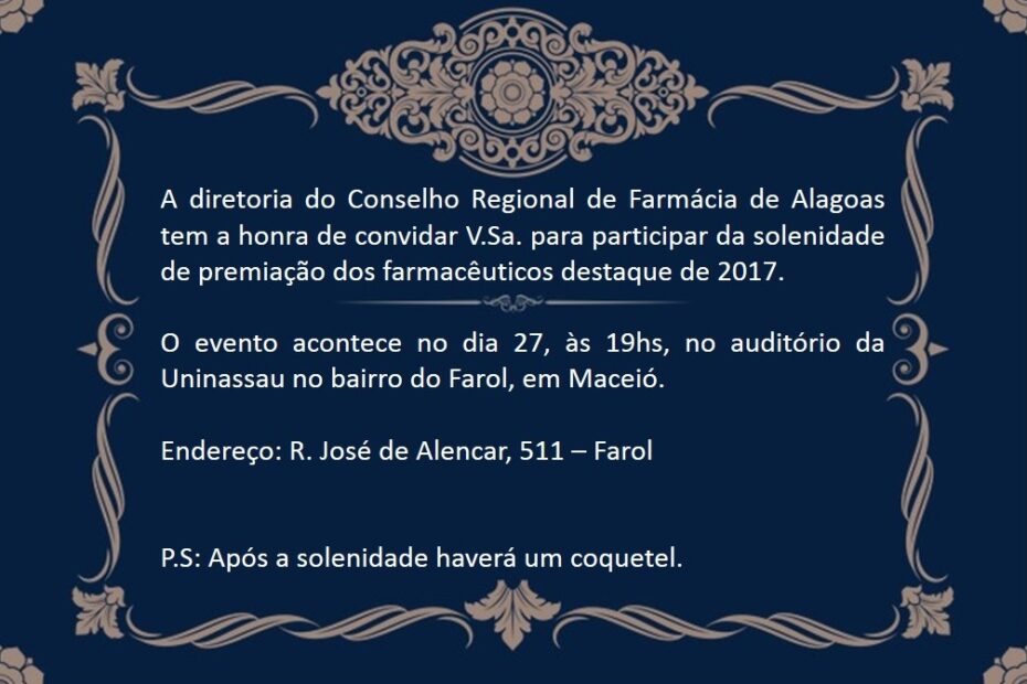 O Conselho Regional de Farmácia de Alagoas encerra as atividades comemorativas da semana do Dia Nacional do Farmacêutico com a solenidade de entrega do prêmio…