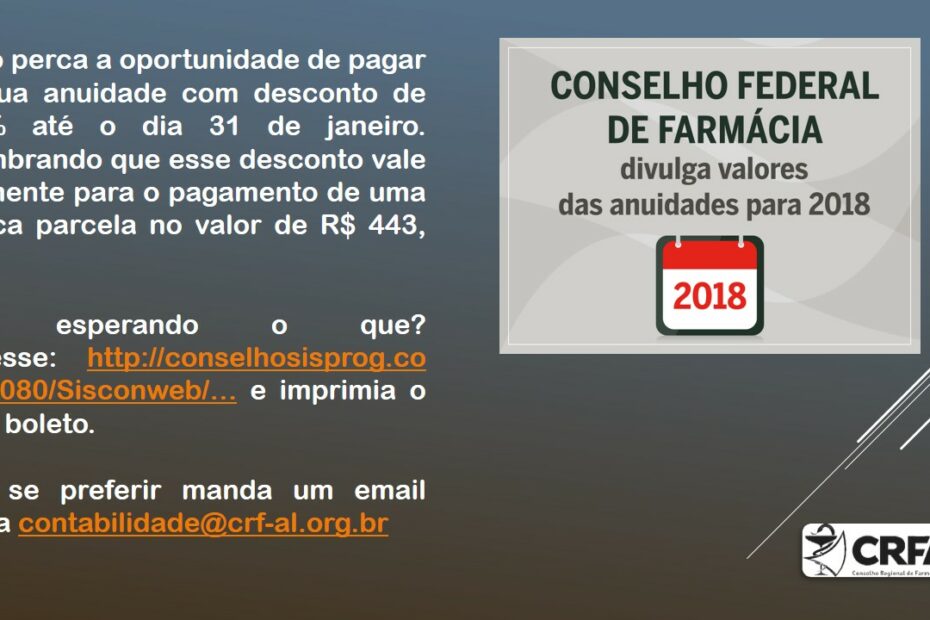 O desconto de 15% no valor da sua anuidade é até o dia 31 de janeiro. Não perca esse benefício! Acesse: http://conselhosisprog.com:8080/Sisconweb/?sR1=ZcKnMDg2MTk5MDAwMDAxMjM=AL ou mande um email para…