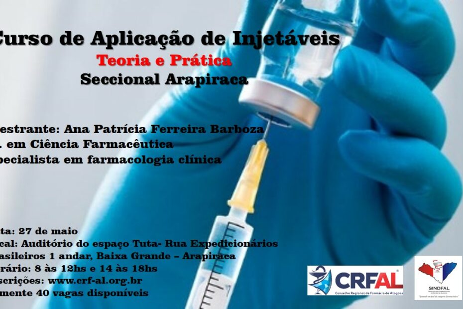 O Conselho Regional de Farmácia de Alagoas, seccional Arapiraca, realiza no próximo dia 27 de maio o curso de aplicação de injetáveis com a mestre…