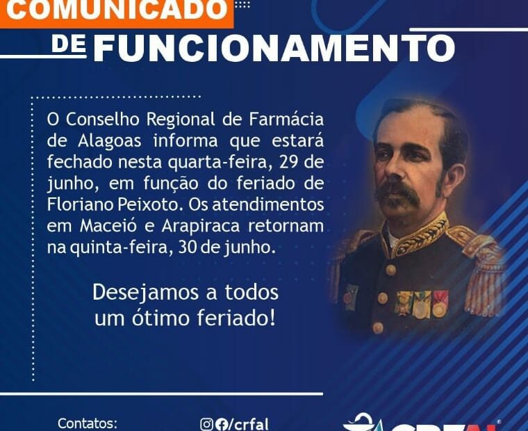O Conselho Regional de Farmácia de Alagoas informa que estará fechado nesta quarta-feira, 29 de junho, em função do feriado de Floriano Peixoto. Os atendimentos…