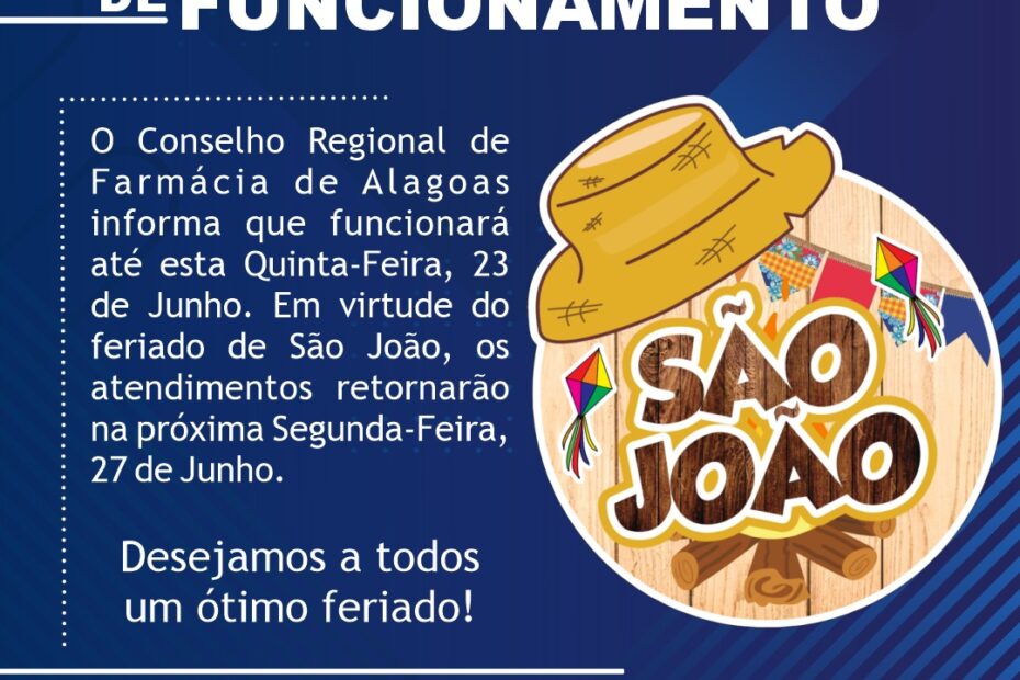 O Conselho Regional de Farmácia de Alagoas informa que funciona normalmente nesta quinta-feira, 23. Em virtude do feriado de São João, a sede e a…