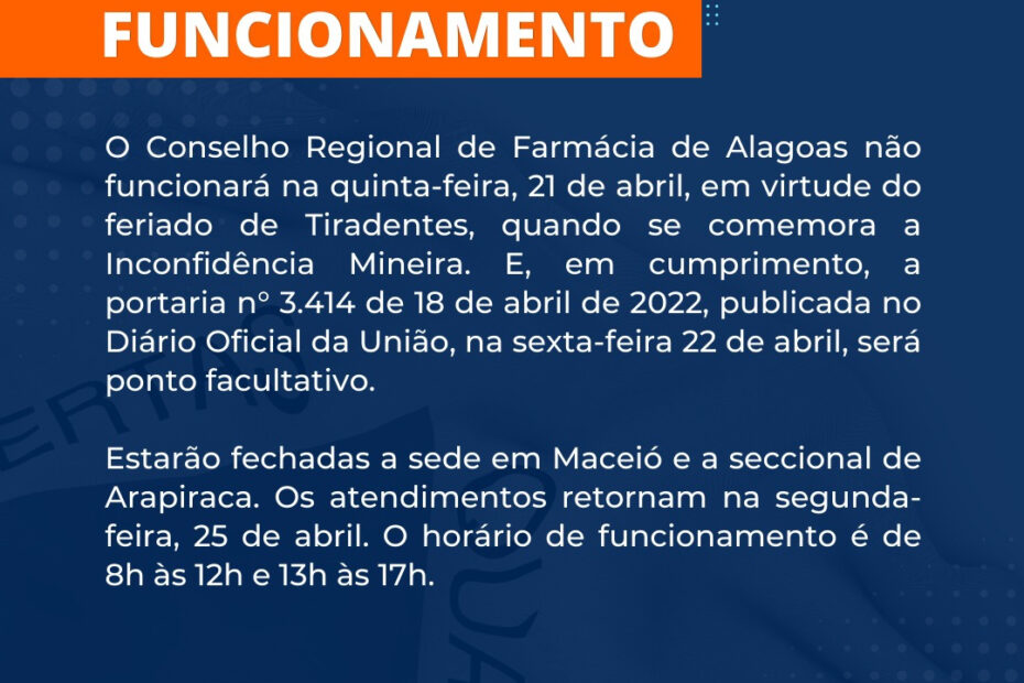 O Conselho Regional de Farmácia de Alagoas não funcionará na quinta-feira, 21 de abril, em virtude do feriado de Tiradentes, quando se comemora a Inconfidência…