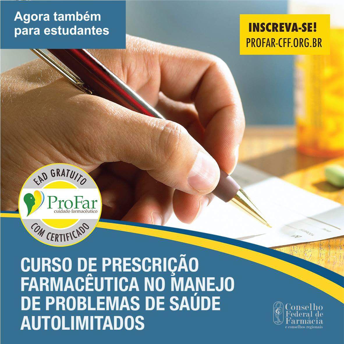 O Conselho Federal de Farmácia (CFF) acaba de liberar as inscrições ao seu curso a distância (EaD) “Prescrição Farmacêutica no Manejo de Problemas de Saúde Autolimitados” também para estudantes do último ano ou dos dois últimos períodos do curso de graduação em Farmácia.