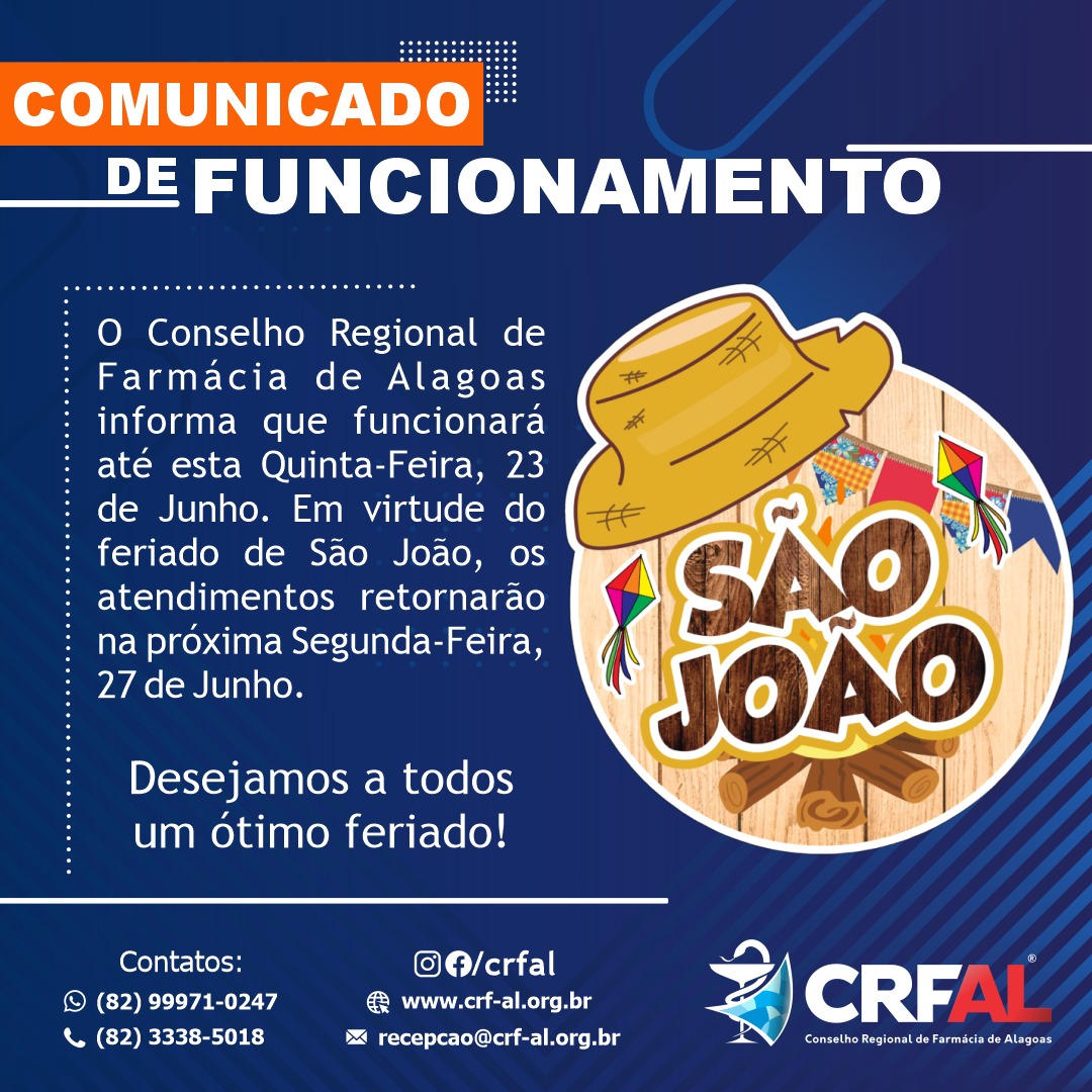 O Conselho Regional de Farmácia de Alagoas informa que funciona normalmente nesta quinta-feira, 23. Em virtude do feriado de São João, a sede e a seccional estarão fechadas no dia 24, retornando as atividades na segunda-feira, 27.