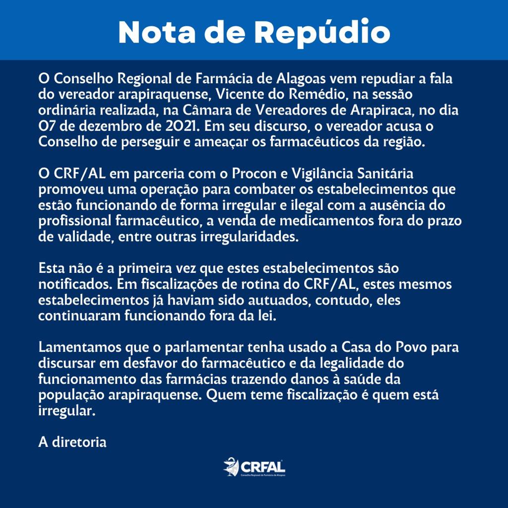 O Conselho Regional de Farmácia de Alagoas vem repudiar a fala do vereador arapiraquense, Vicente do Remédio, na sessão ordinária realizada, na Câmara de Vereadores de Arapiraca, no dia 07 de dezembro de 2021. Em seu discurso, o vereador acusa o Conselho de perseguir e ameaçar os farmacêuticos da região.