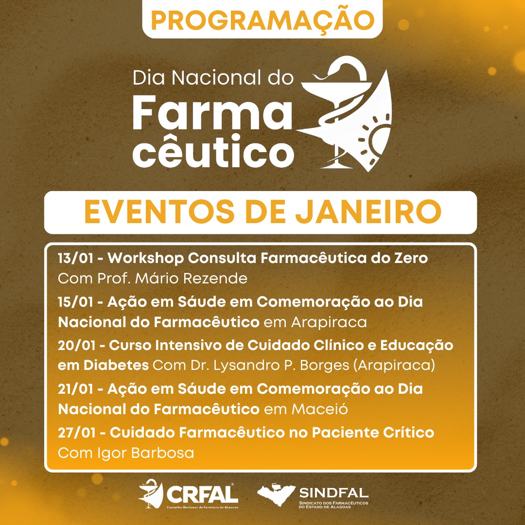 Em alusão ao dia nacional do farmacêutico, o Conselho Regional de Farmácia de Alagoas promove um mês inteiro com atividades voltadas para os farmacêuticos, estudantes de farmácia e a população em geral. As comemorações começam no dia 13 de janeiro com o workshop: Consulta Farmacêutica do Zero com farmacêutico Mário Rezende voltada para farmacêuticos e estudantes de farmácia, no centro de inovação tecnológica, no bairro do Jaraguá.