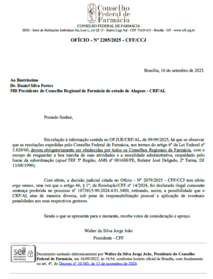 Esclarece-se, ainda, que a decisão judicial foi proferida em desfavor do Conselho Federal de Farmácia (CFF), ao declarar a ilegalidade de dispositivo da Resolução CFF nº 14/2024 que exigia exclusivamente vínculo celetista. Diante disso, o CRF-AL, de forma responsável e institucional, questionou formalmente o CFF acerca do alcance da decisão, indagando se seus efeitos se limitariam a estabelecimentos vinculados à ABCFARMA ou se se aplicariam a todos. Em resposta expressa, o Presidente do CFF, Dr. Walter Jorge João, através do ofício Nº 2205/2025 – CFF/CCJ, informou que a decisão possui efeito erga omnes, aplicando-se a qualquer estabelecimento farmacêutico, e não apenas aos associados da ABCFARMA, afastando definitivamente interpretações restritivas que vêm sendo indevidamente divulgadas.