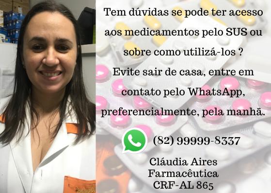 Ela explica que o atendimento acontece pela manhã e os pacientes podem tirar as dúvidas quanto ao uso dos medicamentos disponibilizados pelo SUS. “Essa foi uma forma que encontrei para ajudá-los neste momento, sem deixar de fazer o trabalho de assistência farmacêutica e resguardando a saúde de todos”, pontuou.