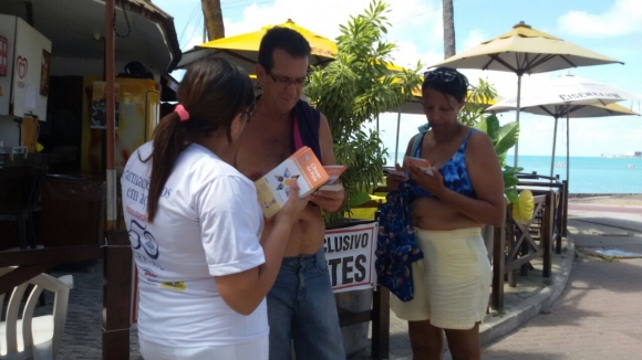 Farmacêuticos e estudantes do Centro Universitário Maurício de Nassau estiverem ontem, na orla da Ponta Verde e Pajuçara orientando a população sobre os cuidados com a pele para evitar o câncer de pele. A ação aconteceu em função do dia mundial de combate ao câncer e foi de iniciativa da Comissão de Farmácia Comunitária do Conselho Regional de Farmácia de Alagoas (CRF-AL).