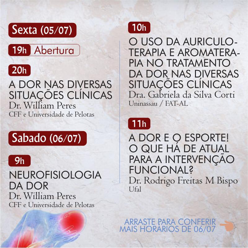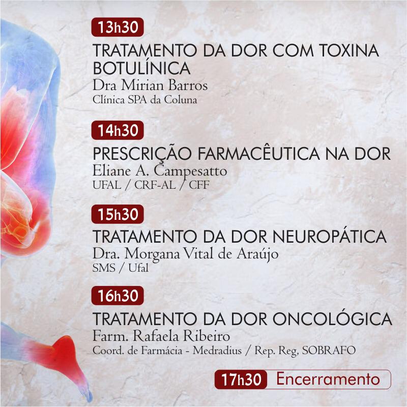 O Conselho Regional de Farmácia de Alagoas (CRF/AL) realiza o I Simpósio Alagoano de Dor para profissionais farmacêuticos e alunos de farmácia a partir do oitavo período. Este é o terceiro evento no formato de simpósio organizado pela comissão de ensino do conselho neste ano, além dos cursos e minicursos já realizados.