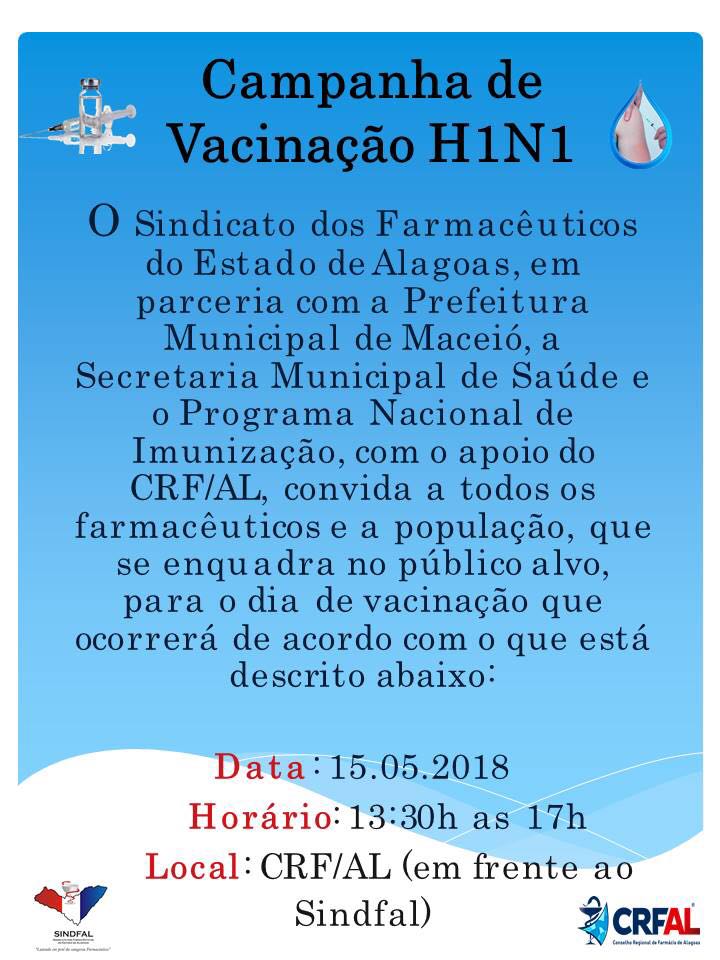 Na próxima terça-feira, 15, o Sindicato dos Farmacêuticos de Alagoas em parceria com a Secretaria de Saúde de Maceió estará imunizando os profissionais de saúde de 13h30 às 17hs em frente ao Sindfal que fica localizado nas dependências do Conselho Regional de Farmácia de Alagoas.
